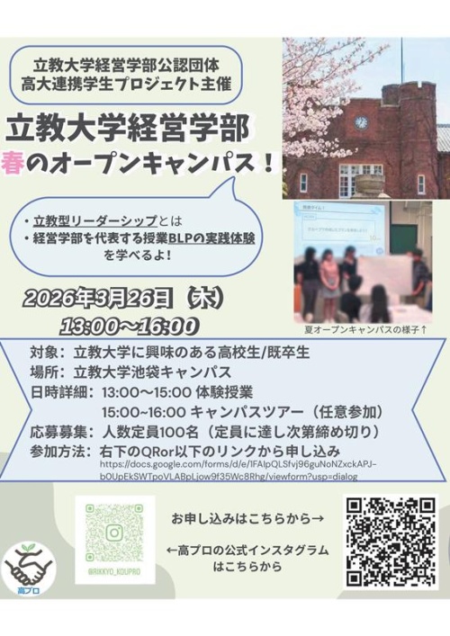 この度、立教大学経営学部公認の学生団体「高大連携学生プロジェクト」による、春のオープンキャンパスが開催されます!こちらのオープンキャンパスでは、経営学部で行われている実際の授業体験を高校生の皆さん向けに実施します!
