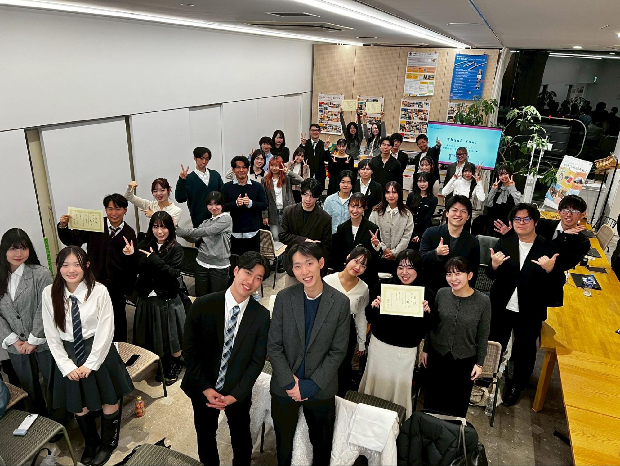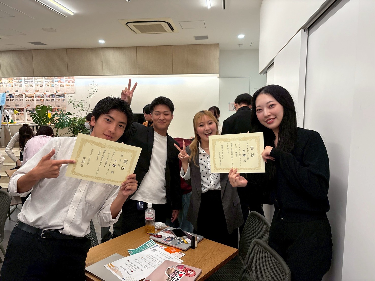11月27日に行われた最終発表会では、三井不動産の方々や日本橋で活躍する実務家の方々を審査員に迎え、全9チームが熱意あふれるプレゼンテーションを行いました。 「大学生ならではの斬新な視点」や「日本橋ならではの特徴」を基準に厳正な審査が行われ、1班(大矢侑果、伊東音弥、馬杉奈侑、宇田川昌範)と6班(小池葵子、山田吏緒、米中瑠希、西村あかね)が「クライアント賞」をW受賞しました。