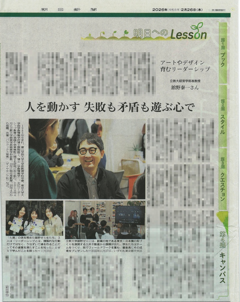 2026年2月26日(木)の朝日新聞朝刊(教育面「明日へのLesson」)にて、本学部准教授の舘野泰一先生のゼミナール(リーダーシップ開発)の取り組みが紹介されました。