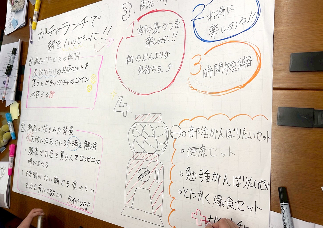 ワークでは「ついコンビニに寄っちゃう状況ってどんな時?」「朝の通学時の不満や叶えたい理想」など段階を踏んで、プランの土台を形作ります。まずは個人で考え、次にグループで共有し、アイデアを広げていきます。
